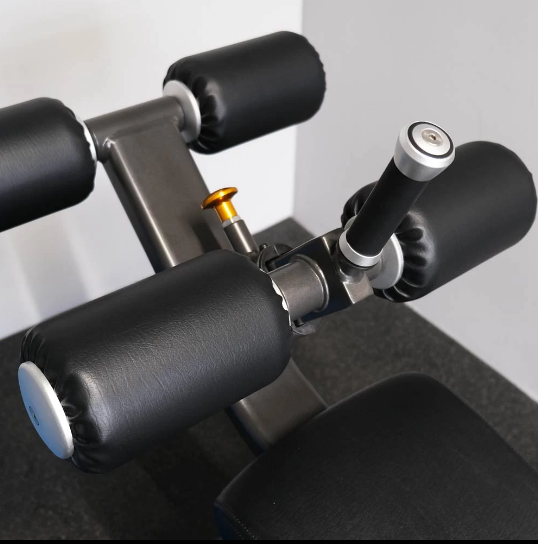 Скамья оснащена регулируемыми элементами, такими как спинка и валик для ног, что позволяет адаптировать тренировки под индивидуальные потребности пользователя. Транспортировочные ролики облегчают перемещение скамьи по залу.