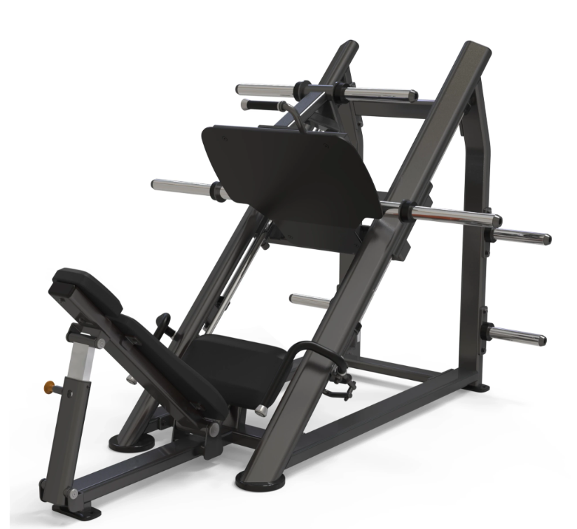 Конструкция тренажёра выполнена с соблюдением классической биомеханики жима под углом 45 градусов, что позволяет пользователю работать с большими весами при сниженной осевой нагрузке на позвоночник. Это делает упражнение безопасным и эффективным как для начинающих, так и для опытных спортсменов.