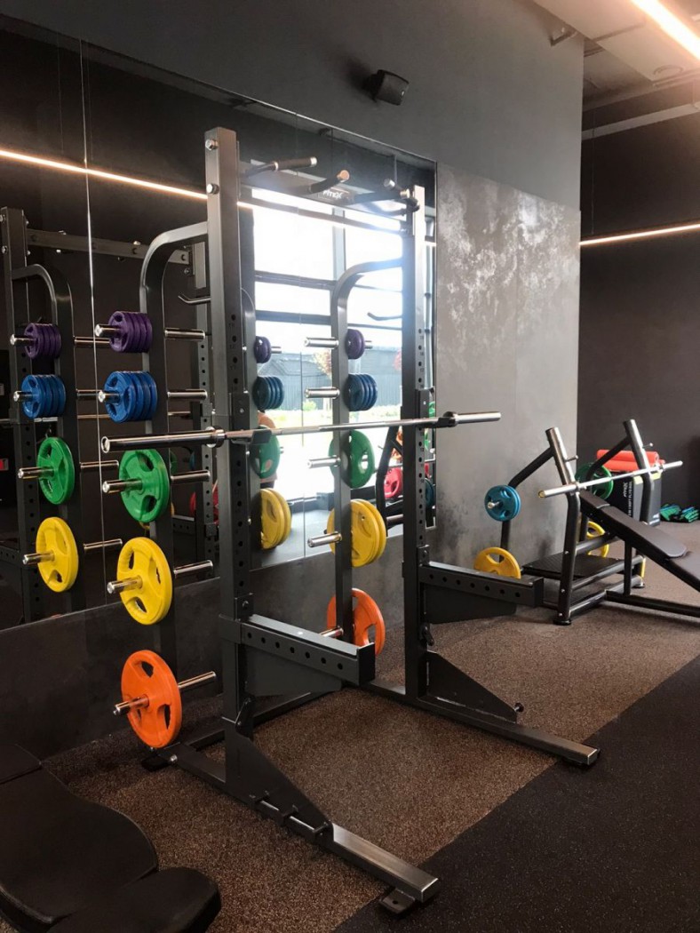 Каркас полурамы выполнен из конструкционной стали марки Q235 с квадратным профилем 80×80×3 мм. Такой размер обеспечивает исключительную жёсткость и устойчивость при любых нагрузках, что особенно важно при выполнении приседаний, жимов и становых тяг. Конструкция выдерживает вес до 300 кг, сохраняя стабильность и надёжность при интенсивных тренировках.
