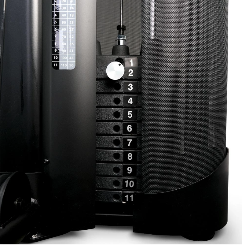Два весовых стека по 52 кг закрыты надежным кожухом из сетчатого нейлона, что повышает безопасность во время эксплуатации. Коэффициент сопротивления 1:1 гарантирует, что выбранный вес полностью передается на рабочую траекторию без потерь.