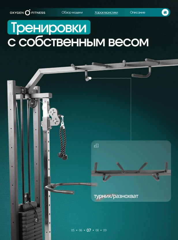 | Дополнительно | канат для трицепса, многофункциональный турник, многофункциональная рычажная тяга (регулировка по высоте - 8 ур.), брусья (регулировка по высоте - 15 ур, пружинные замки для дисков - 2 шт, накопители для дисков ф50 мм. |